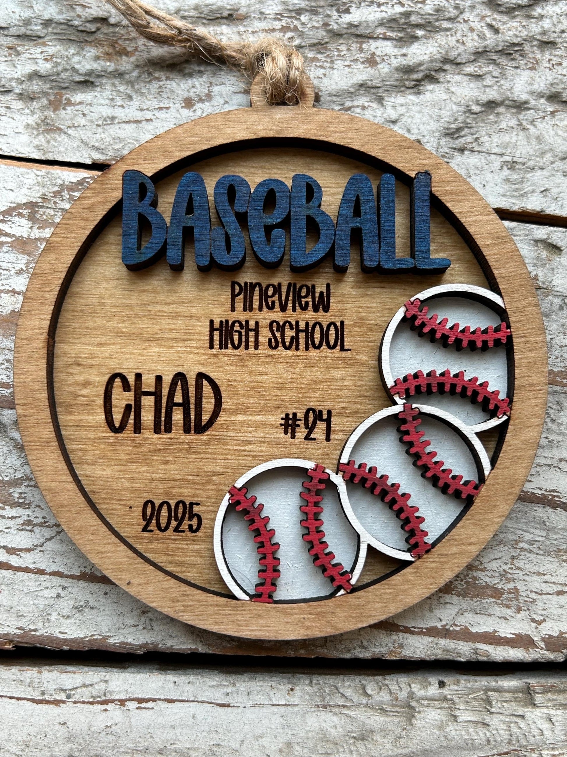 Commemorate a baseball season with a custom Personalized Baseball Christmas Tree Ornament. Makes a great gift or stocking stuffer. Also would make a great gift for baseball coach. 2 layer laser cut and engraved with your players name and number. You will also choose the color we paint the word “Baseball “ to match your players team color. Approx 3 3/4” wide.