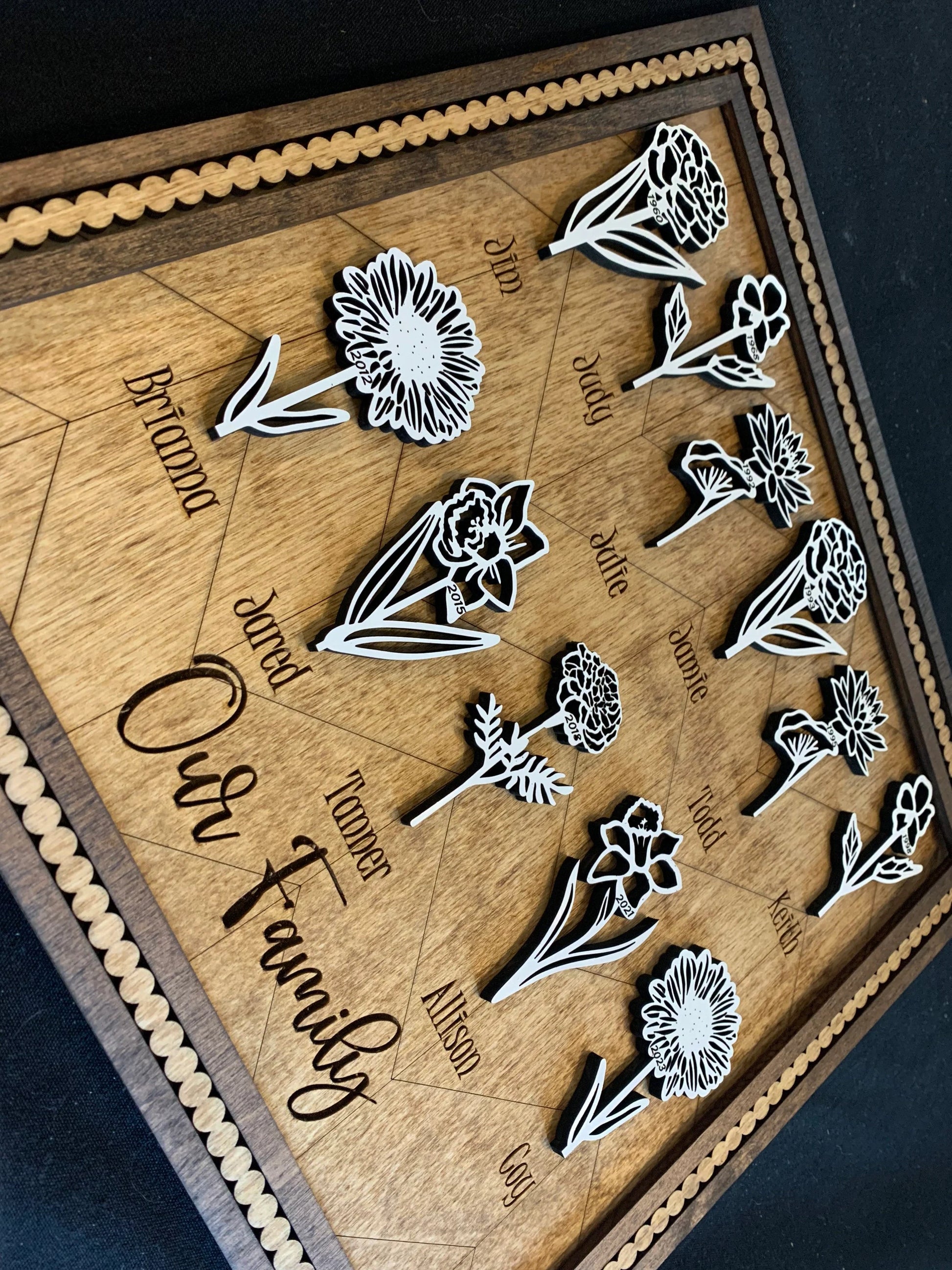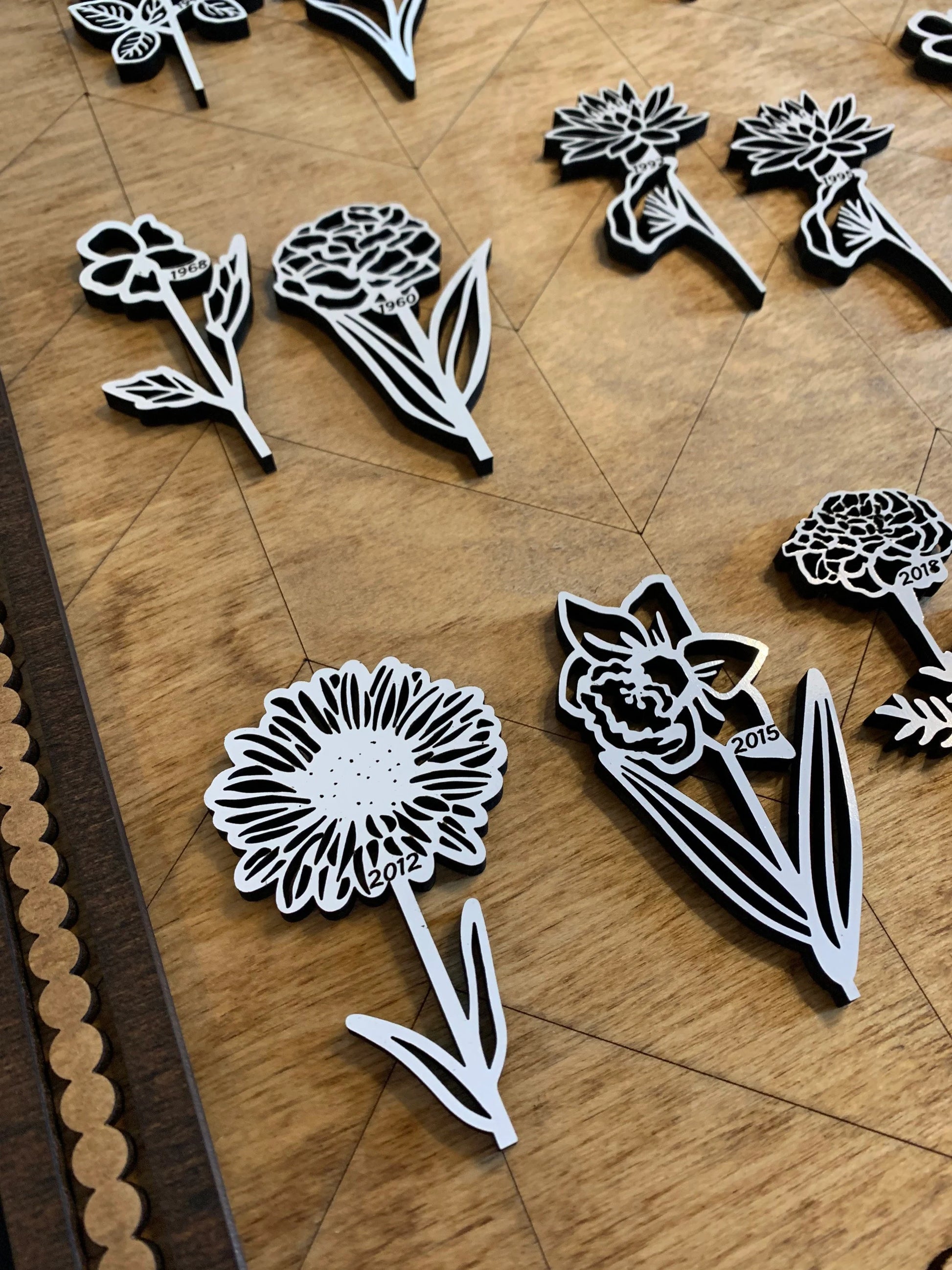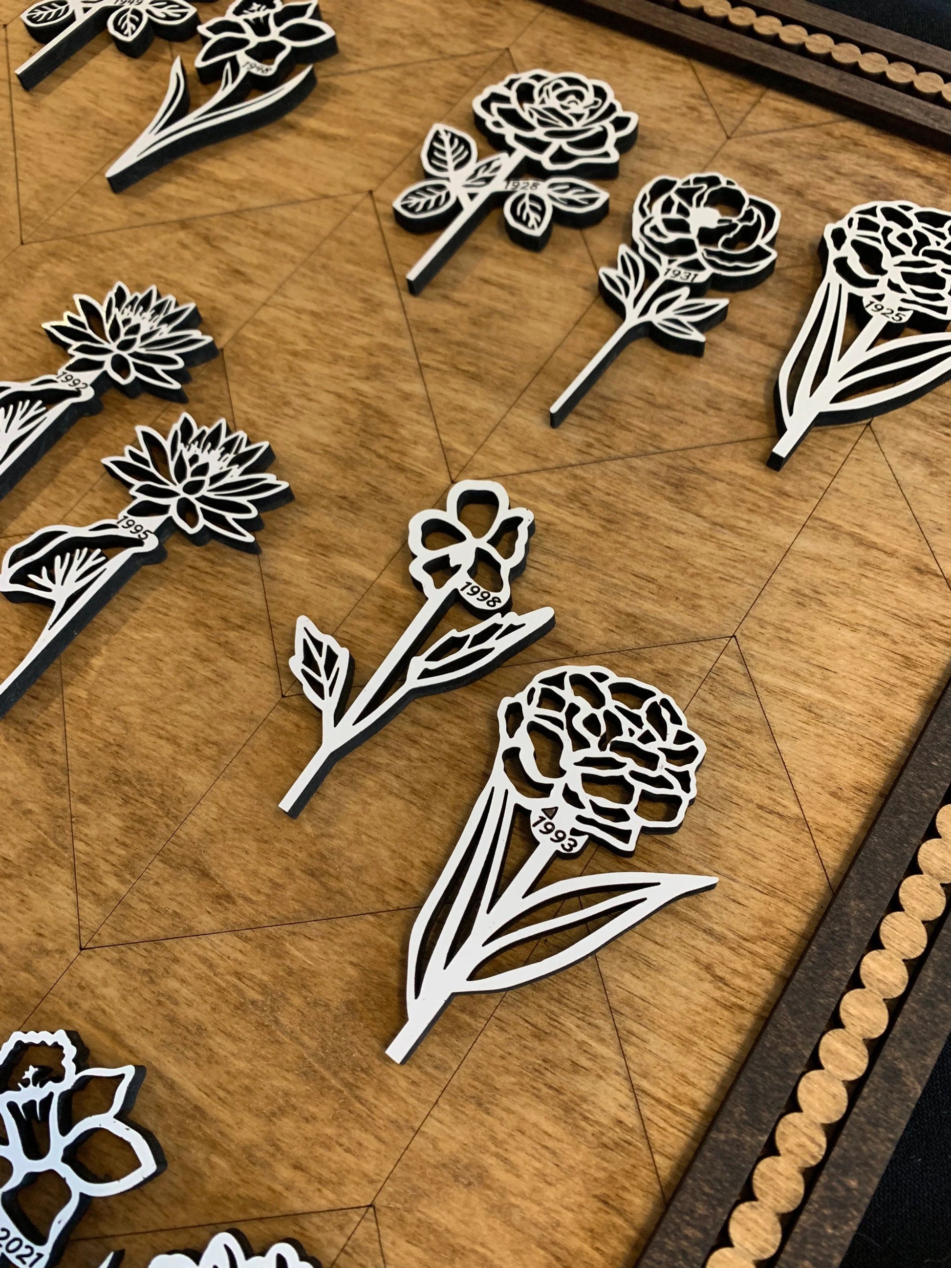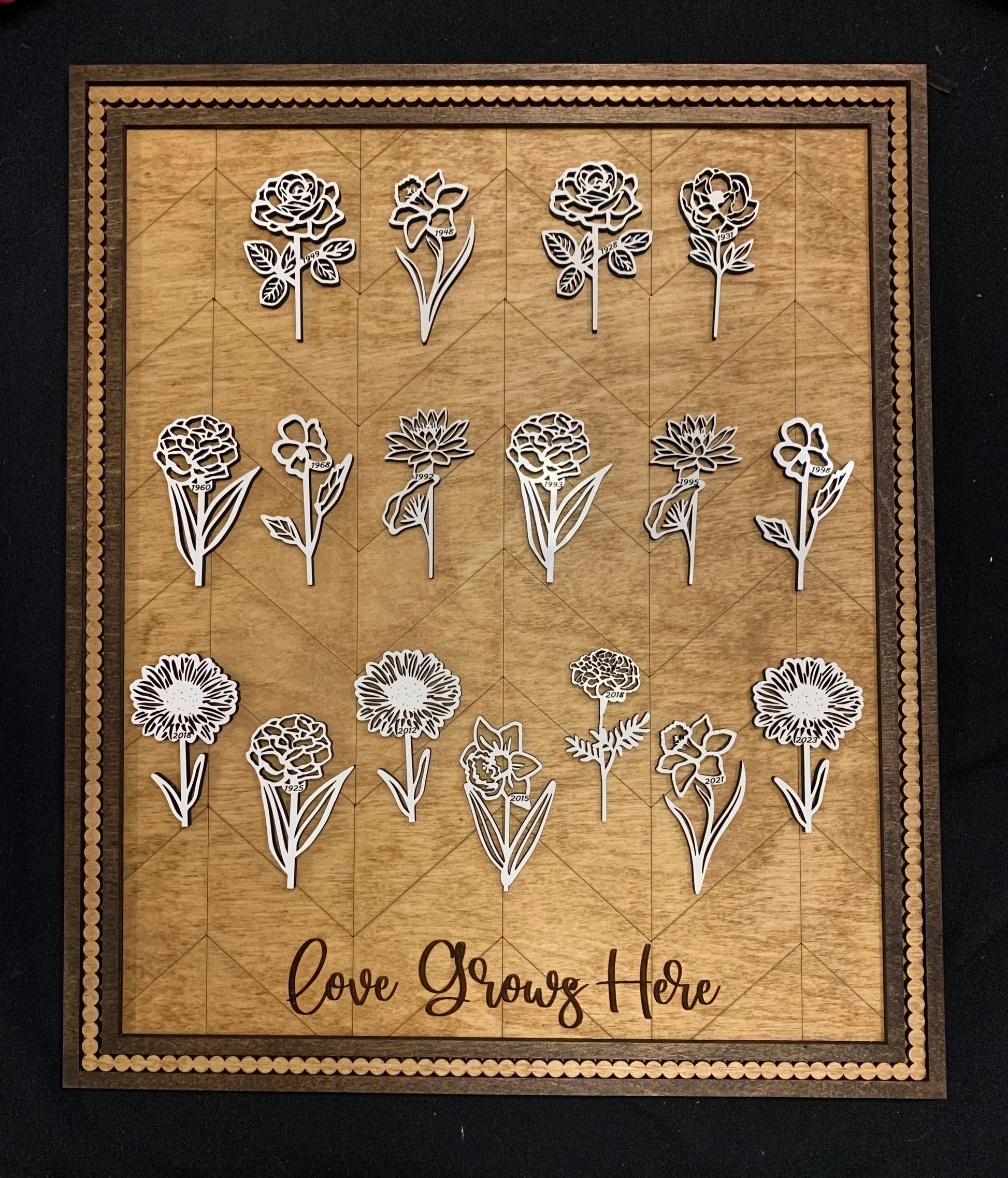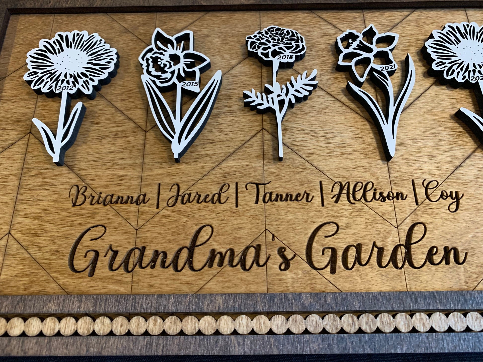 Personalized Birth Month Flowers sign with 3 to 21 flowers. (See our other listing for 1-2 birth flowers). Laser cut and laser engraved. Beautiful gift for that special mom and/ or grandma. 3 sizes depending on the number of flowers. 3 to 6 flowers; approx 12 3/4”x 7 3/4” 7-12 flowers approx 12 3/4” x 12” and 13 -21 flowers approx 15” x 18”. Each flower measures approx 3” tall. Yours can be personalized with your choice of words. Some suggestions: Mom’s Garden, Grandma’s Bouquet, Family last name, Love Grows Here, This Bunch Loves Our Mom. We can engrave the birth years on the flowers (as pictured) as well as the names that correspond with the flowers (either underneath each flower or all at the bottom above the title). Each sign has a 2 layers of wood with the flowers cut and engraved out of white board. A hanger is included for the sign. Please message me with any questions. I tend to answer very quick.