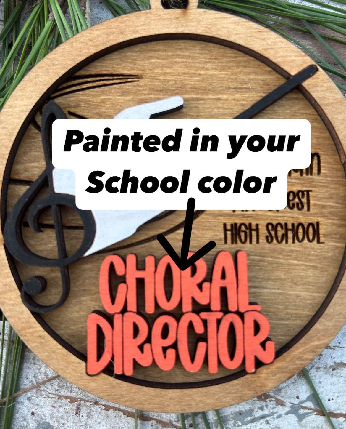 Commemorate a chorus season for your Choral Director with a custom Personalized Choir Christmas Tree Ornament. We will personalize with name, school (or church, etc.) and/or year. Perfect gift for the chorus teacher or Church choir director. 2 layer laser cut and engraved. You will also choose the color we paint “Choral Director ” to match the school color. Approx 3 3/4” wide.