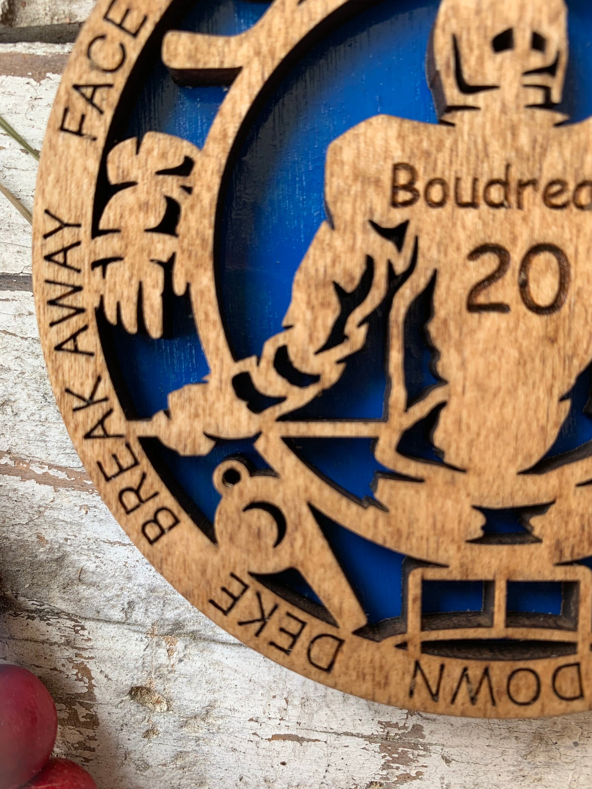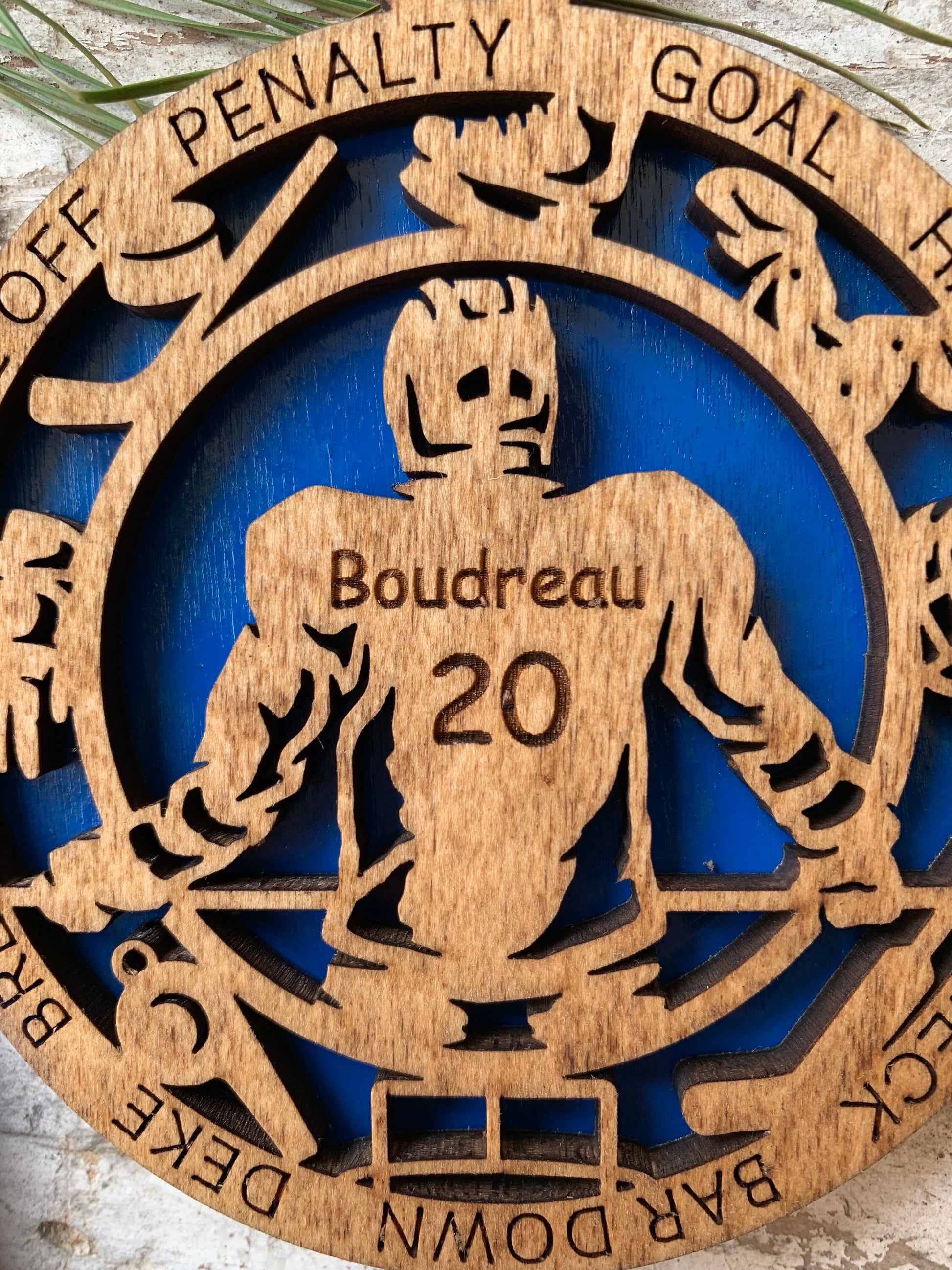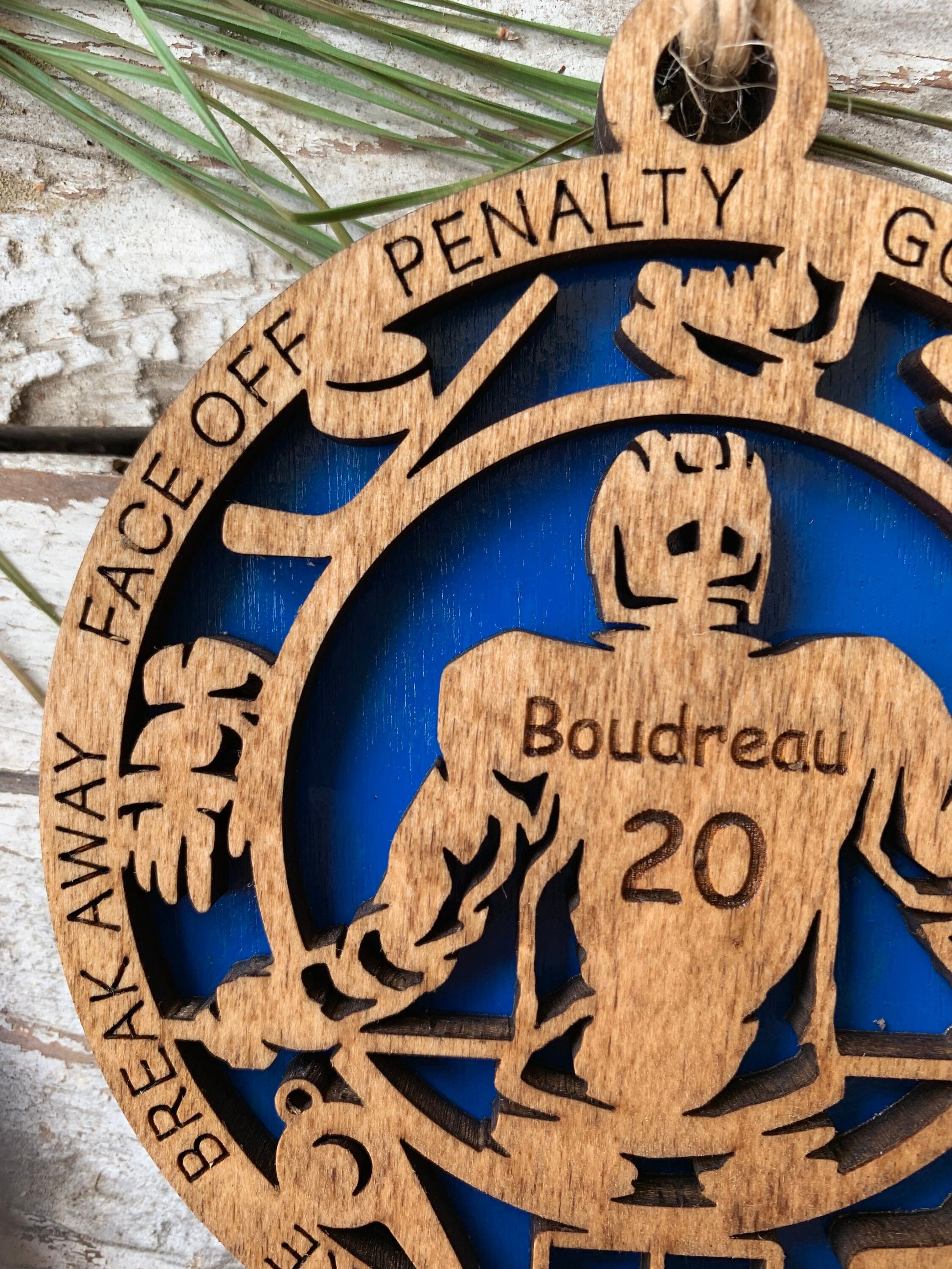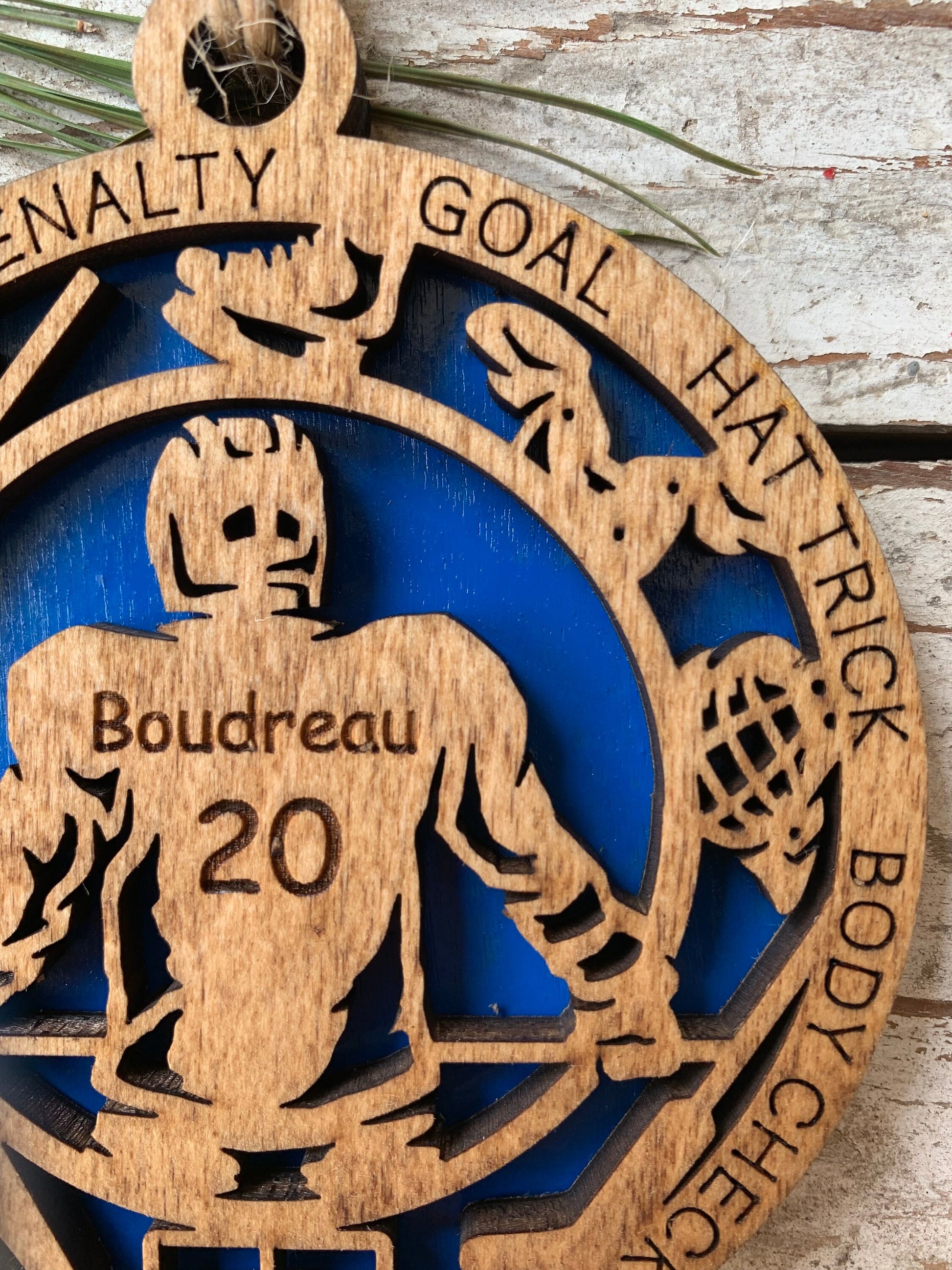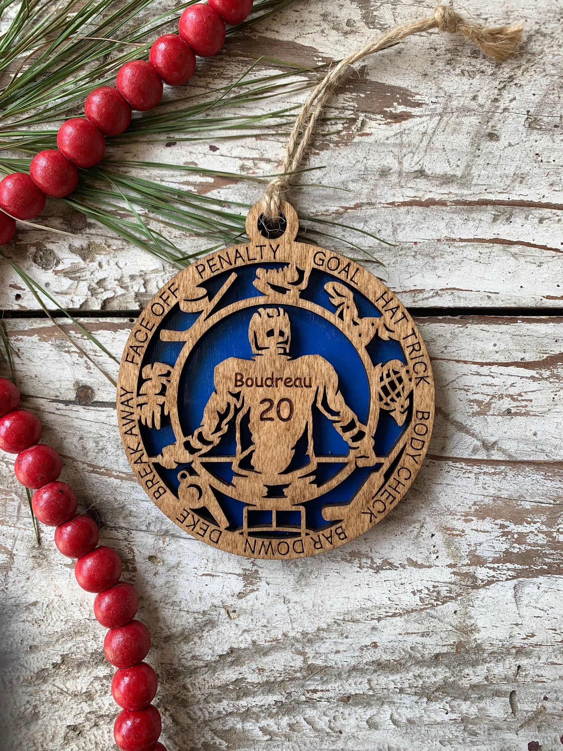 Commemorate a hockey season with a custom Personalized Hockey Christmas Tree Ornament. Makes a great gift or stocking stuffer. Also would make a great gift for hockey coach. 2 layer laser cut and engraved with your players name and number. You will also choose the background color to match your players team color. Approx 3 3/4” wide.