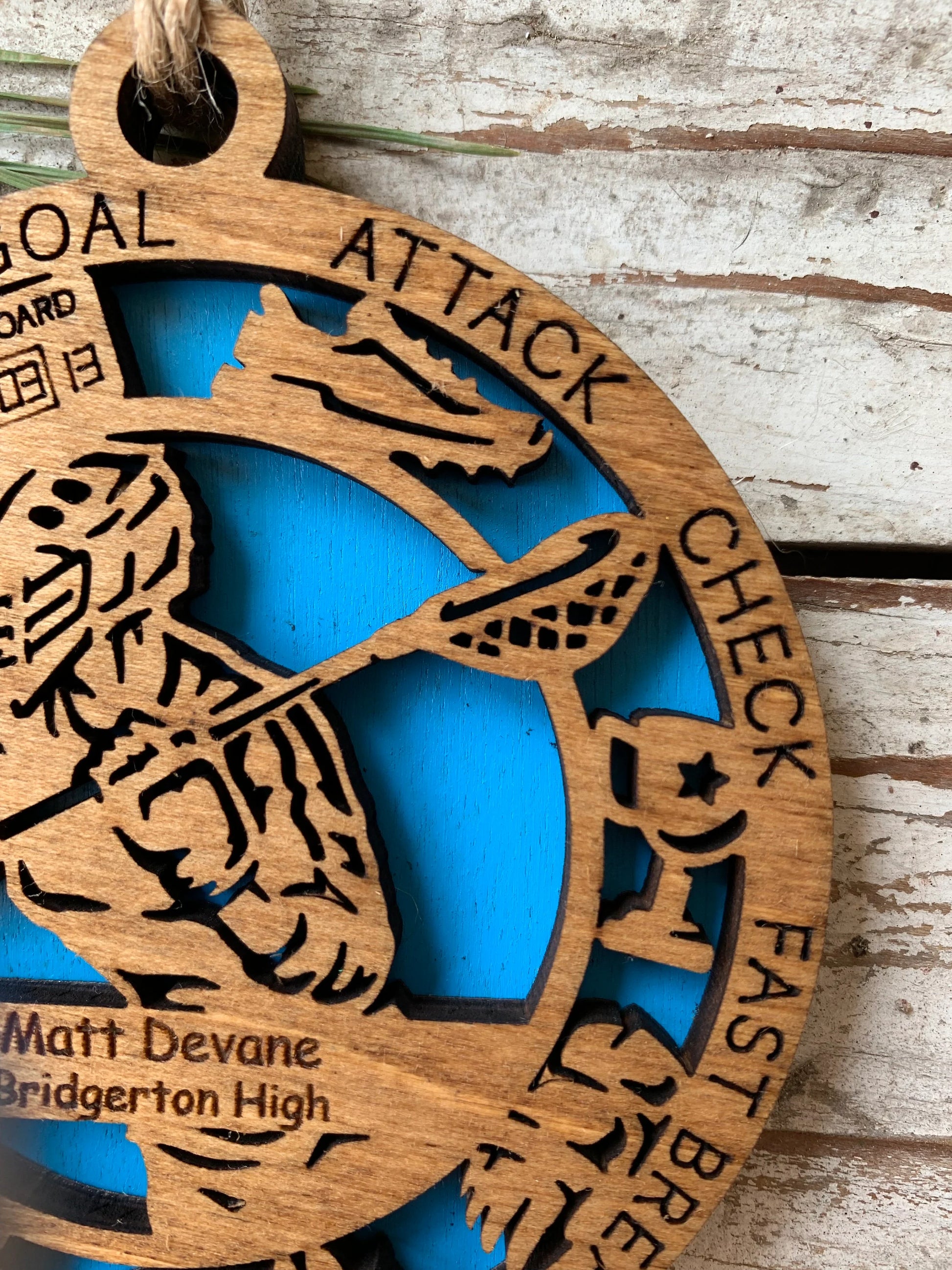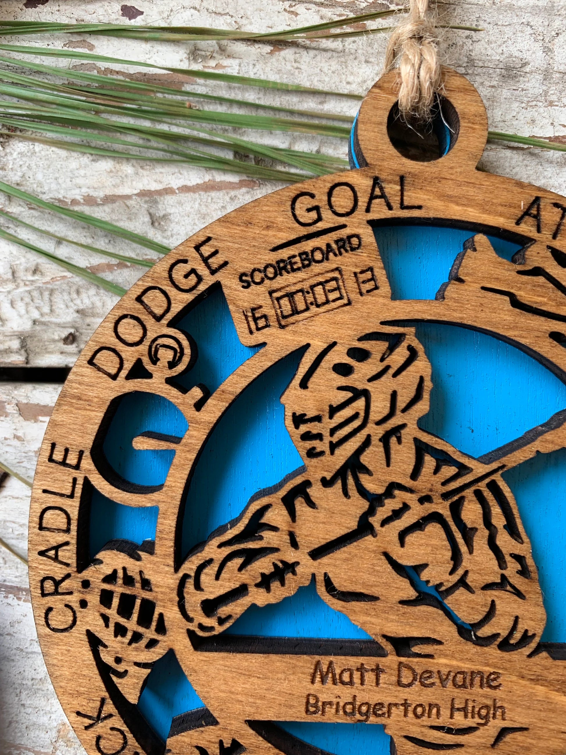 Commemorate a lacrosse season with a custom Personalized Lacrosse Christmas Tree Ornament. Makes a great gift or stocking stuffer. Also would make a great gift for lacrosse coach. 2 layer laser cut and engraved with your players name and/or school. You will also choose the background color to match your players team color. Approx 3 3/4” wide.