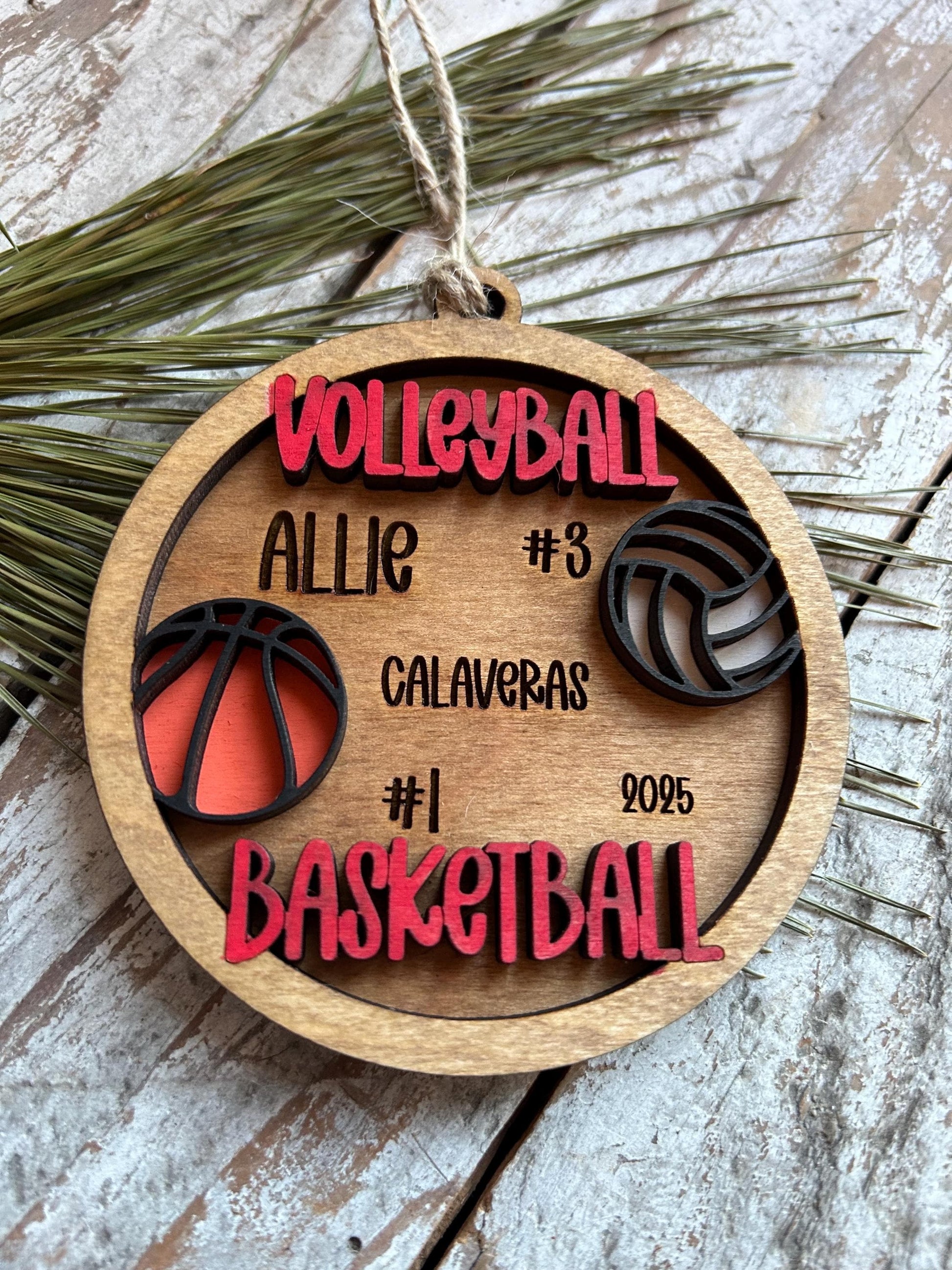 Commemorate a volleyball and basketball season with this unique custom Personalized Volleyball/Basketball Christmas Tree Ornament that I personally designed. Makes a great gift or stocking stuffer. Also would make a great gift for a multi sport volleyball and basketball coach. 2 layer laser cut and engraved with your players name, school, year and numbers. You will also choose the color we paint the word “Volleyball and Basketball“ to match your players team color. Approx 3 3/4” wide.