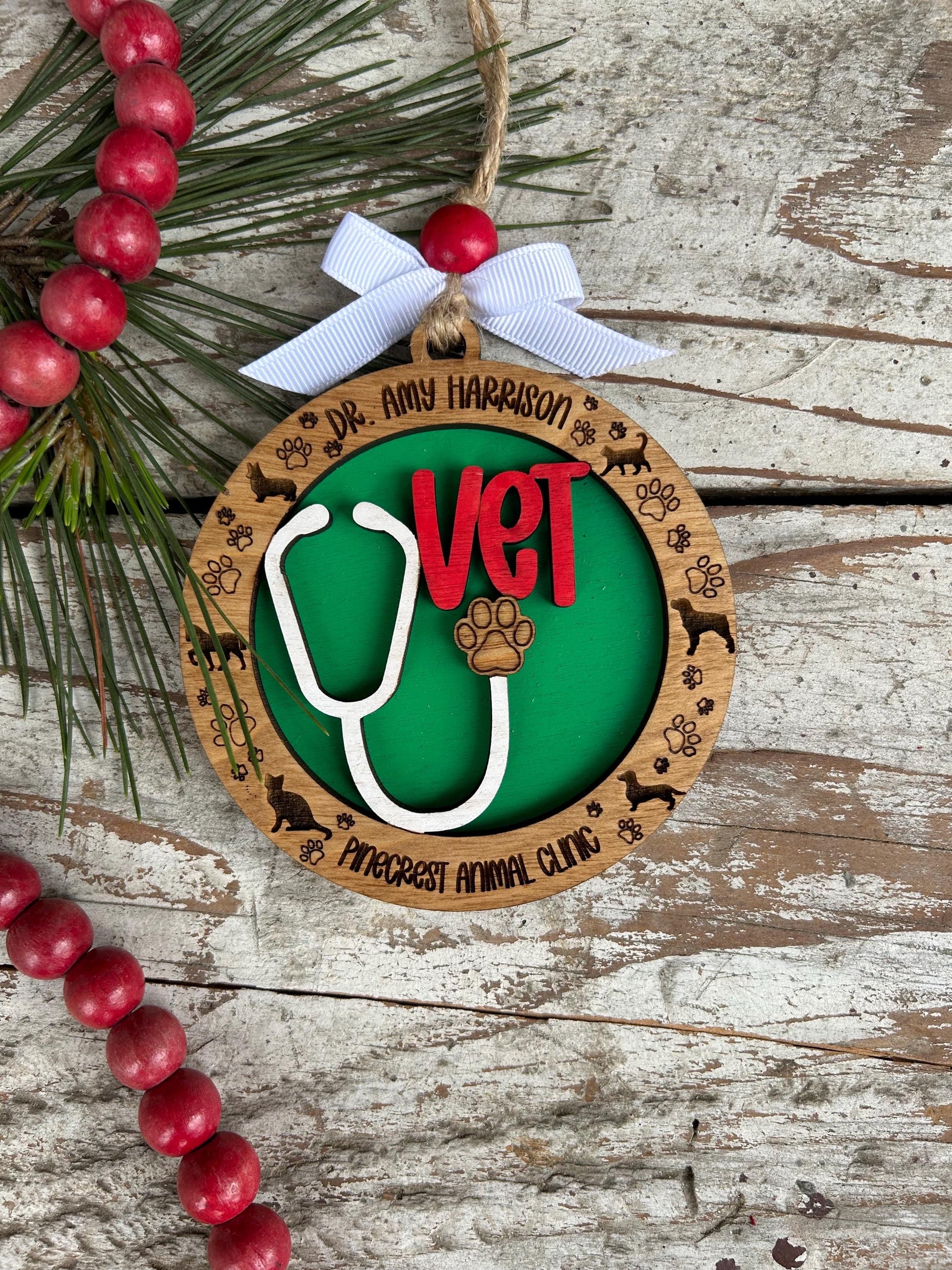 Custom Veterinarian Christmas tree ornament personalized with your Vets name. This ornament is the perfect gift for the Veterinarian that takes such great care of your pet and treats them as their own. It is a wonderful way to show your appreciation of their care with your pet. A beautiful handpainted, laser cut and laser engraved 2 layer wood ornament that is approx 3 3/4 " will make a great addition to their tree.