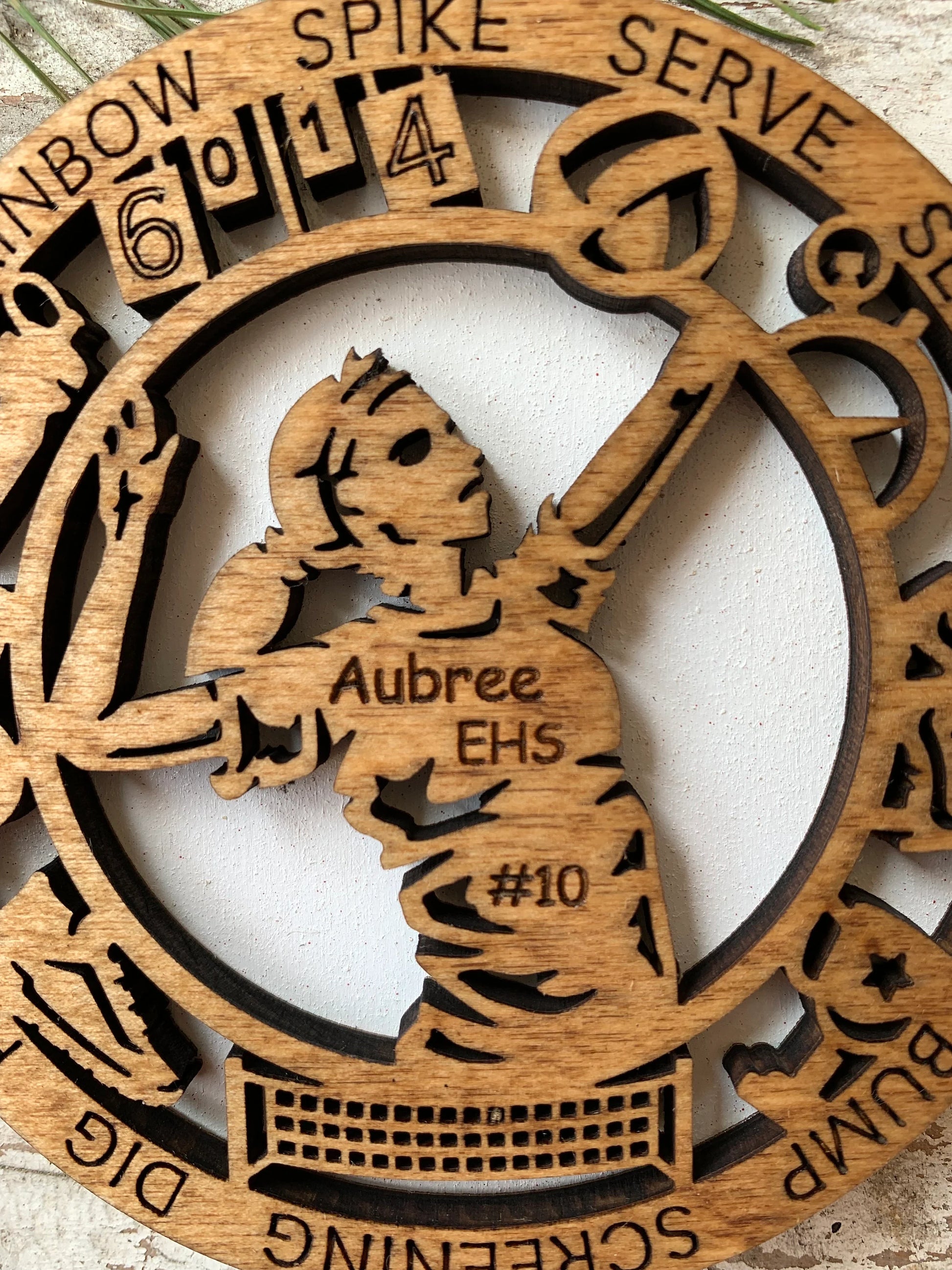 Commemorate a Volleyball season with a custom Personalized Volleyball Christmas Tree Ornament. Makes a great gift or stocking stuffer. Also would make a great gift for volleyball coach. 2 layer laser cut and engraved with your players name and number. You will also choose the background color to match your players team color. Approx 3 3/4” wide.